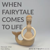 Mermaid brings together sophisticated and simple Danish design. You can create new expressions simply by turning her head, fin, body, or arms. The head can also be taken off to put the arms over the head. The lower part of her body is made of oak wood, while the upper parts are made out of maple wood.